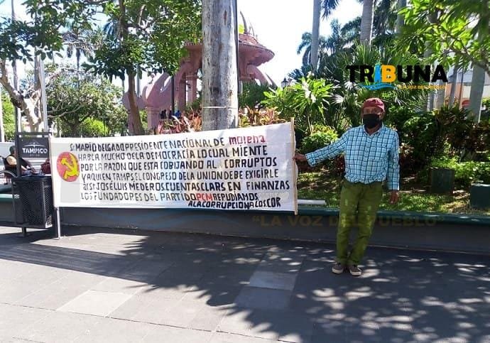 “Señor Mario Delgado, presidente Nacional de MORENA habla mucho de la Democracia lo cual miente por la razón que está cobijando al corrupto, y quién aquí en Tamaulipas El Congreso de La Unión debe exigirle al señor José Luis Mederos cuentas claras en finanzas, los fundadores del partido PCM repudiamos a la corrupción”, se leía en la pancarta.