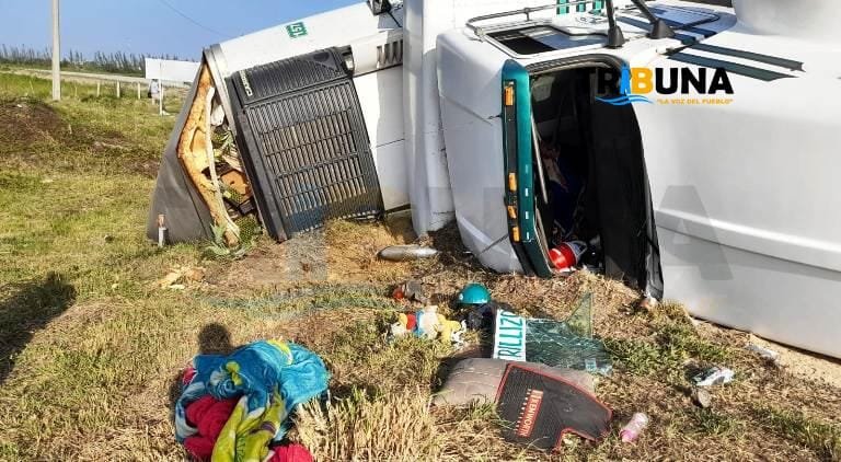 ALTAMIRA, TAM.- La tarde de este jueves se registró la volcadura de un tráiler cargado con 25 toneladas de piña, en el Puente Roto del municipio de Altamira. El operador viajaba junto a su esposa y sus tres hijos, resultando lesionados, siendo auxiliados por paramédicos de Protección Civil Regional y Asipona.